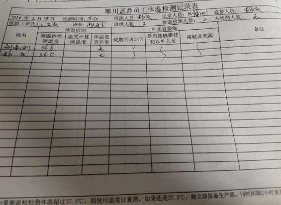 根據(jù)區(qū)政府要求,川藍鼎迅速對春節(jié)期間離攀員工進行了全面排查,對員工春節(jié)期間的外出動向和外來人員接觸情況都明確、詳細的登記在案。對員工身體狀況,公司力求做到隨時了解員工身體狀況,調(diào)往脫硫的員工每日跟隨脫硫班組檢測體溫等身體狀況,留守粉線的人員也與脫硫班組完全同步檢測。