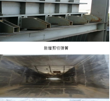 檢修班在接到任務(wù)后,立即對該問題產(chǎn)生的根源進行梳理,對卸料應力進行計算和綜合分析,在確保徹底消除隱患、穩(wěn)定可靠、簡單易行和力爭最低成本的原則下研究可行性技改方案,決定采取四管齊下 :1.在每個石膏倉與框架接觸部位均布增設(shè)剪切彈簧10個(使應力緩釋)。2.將倉內(nèi)錐段原不沾板改為不銹鋼板(滿焊)并直段噴涂鱗片樹脂(使石膏緩降,減小沖擊并消除腐蝕)。3.在真空泵出口增設(shè)減震膨脹節(jié)(隔斷設(shè)備運行震動)。4.繼續(xù)對卸料空氣炮深挖潛能進行技改(以致順暢下料)。